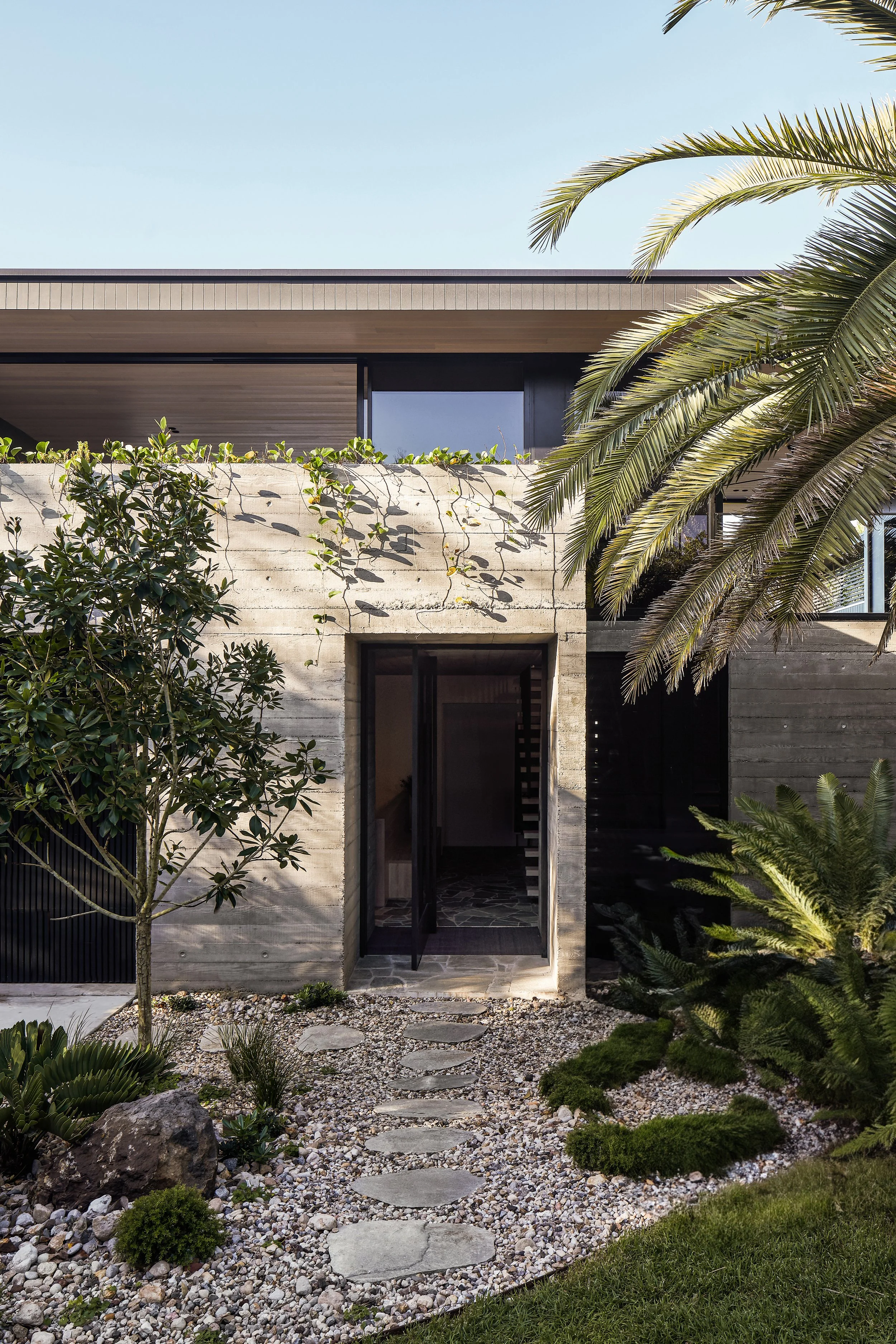 At the lowest level, a courtyard and pool are integrated into the section of the house, forming a sheltered outdoor space that complements the openness of the level above.